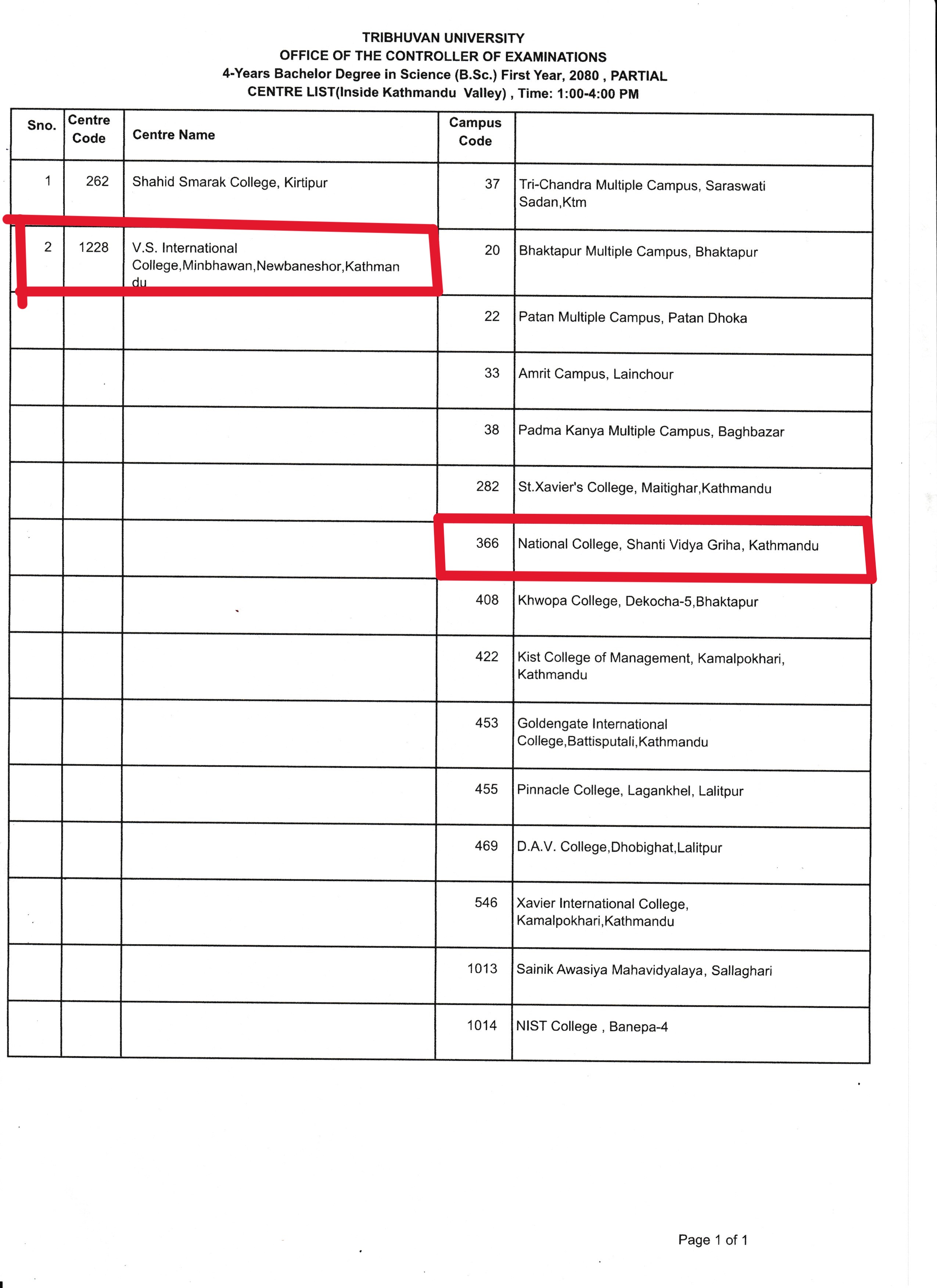 B.Sc. 1st Year , 2080, Partial Exam Center